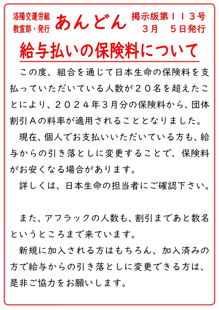 【K113】日本生命の保険料について – 洛陽交運労働組合